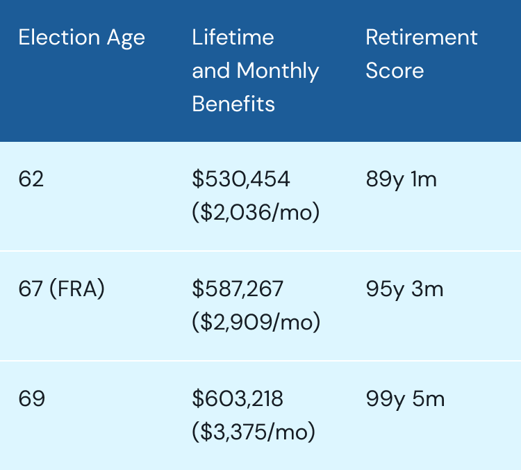 Let’s assume you’re currently 58, married, making $85,000 a year, and planning to retire at age 62. If your life expectancy is age 85, here’s the breakdown of your benefits and Retirement Score by different election ages.