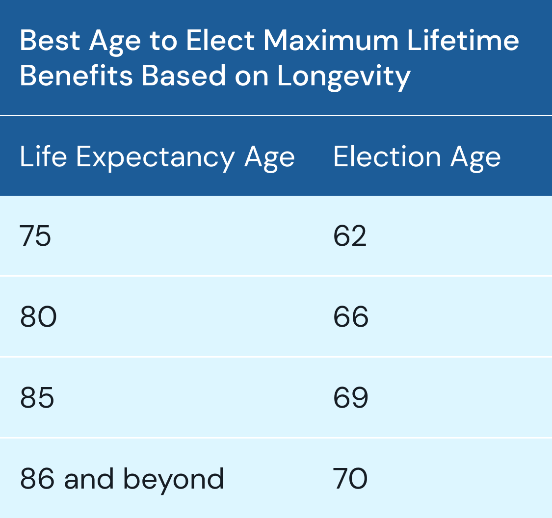 Here are our recommendations on when you should elect your benefits based on your longevity. The Social Security calculator predicts the best age to elect benefits based on your life expectancy to maximize your lifetime benefit.